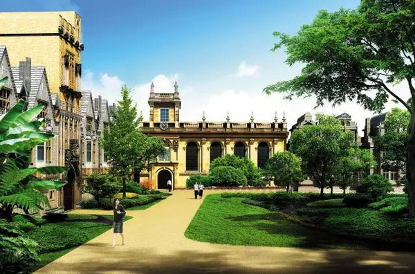 參考牛津大學(xué)莊嚴(yán)的建筑.征創(chuàng)造街區(qū),結(jié)合以灰色板石為材料的大坡度.屋.、米色萊姆石外墻、草坪里院和回廊,使整個街區(qū)都可以感受到猶如知識殿堂般的氛圍.