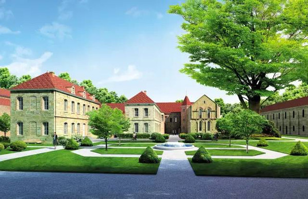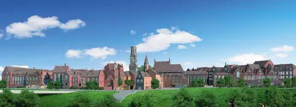參考在人文科學(xué)上聞名的、在德國具有.悠久歷史的海德爾堡大學(xué)的建筑風(fēng)格,以紅砂巖外墻和傳統(tǒng)街區(qū)構(gòu)成建筑群,布置在小山丘上細致而雄偉的城堡和網(wǎng)格狀的街區(qū)形成了鮮明的對比.
