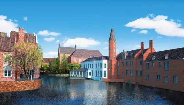 參考比利時城市布魯日連綿小建筑物的街區(qū).點,結(jié)合紅磚外墻、階梯式陡坡屋.等外觀.征,以及.具.色的鐘塔和拱形石橋設(shè)計,形成了與自然環(huán)境契合的街區(qū)空間.