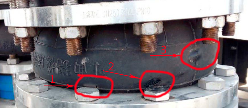 2、這個位置已經(jīng)明顯可以看出橡膠過分變形擠壓在了六角螺栓上面,已經(jīng)被螺栓擠破。