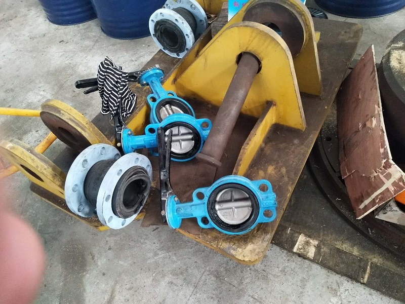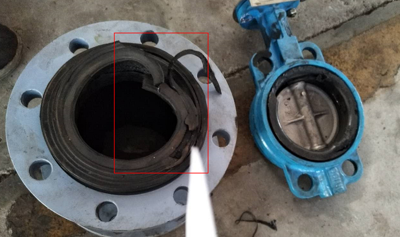 這個是一個做無塔供水設備的客戶,把對夾式軟密封蝶閥與橡膠接頭連接在一起后出現(xiàn)的問題:
