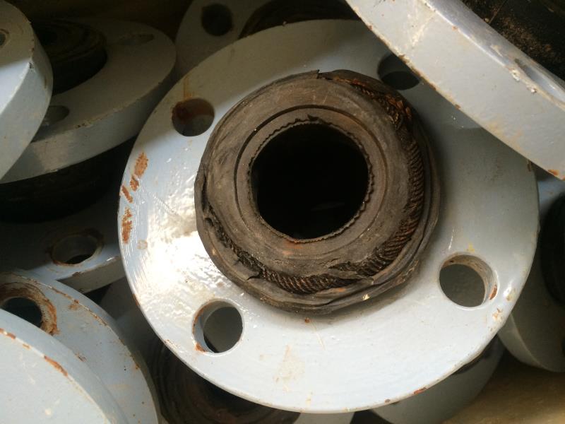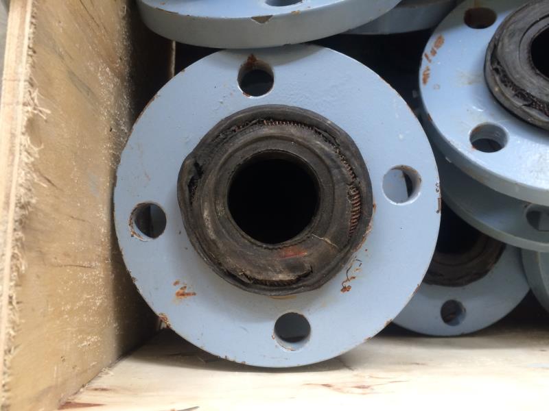 如上圖所示,出現(xiàn)這個情況的,根據我廠技術工程師做分析,主要原因是橡膠接頭直接與對夾式軟密封蝶閥連接,對夾式軟密封蝶閥密封面過小,橡膠接頭密封面與對夾式軟密封蝶閥密封面不配套所致,以下是我廠技術部提供的一組照片,大家可以對比一下密封面的差距。