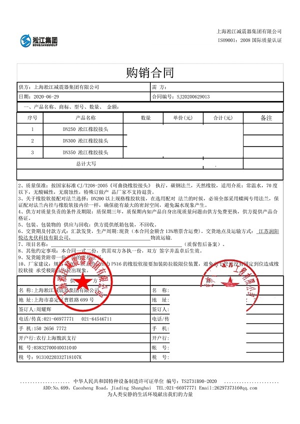 上海淞江減震器集團有限公司官方網(wǎng)站為您介紹:【江蘇潤陽悅達光伏】橡膠接頭合同信息,淞江集團為眾多光伏企業(yè)提供優(yōu)質(zhì)橡膠接頭,產(chǎn)品質(zhì)保5年,品質(zhì)穩(wěn)定可靠。